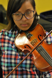 Iveth, an eight grader, knows how to handle difficult situations. Even though Alejandro was not cooperating, she never gave up on him. “Alejandro, come back and sit down!” she roared at him when he got up. He sat down, grabbed the violin and started playing. It was horrible; he played the wrong notes and bowed too hard on the strings. But slowly, Iveth helped him develop his skills. Within the first week he learned a two-minute s ong, but he had five more to go.